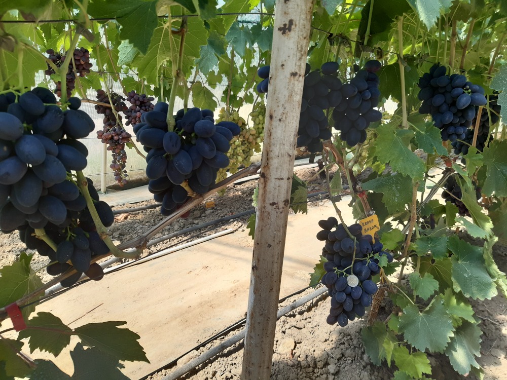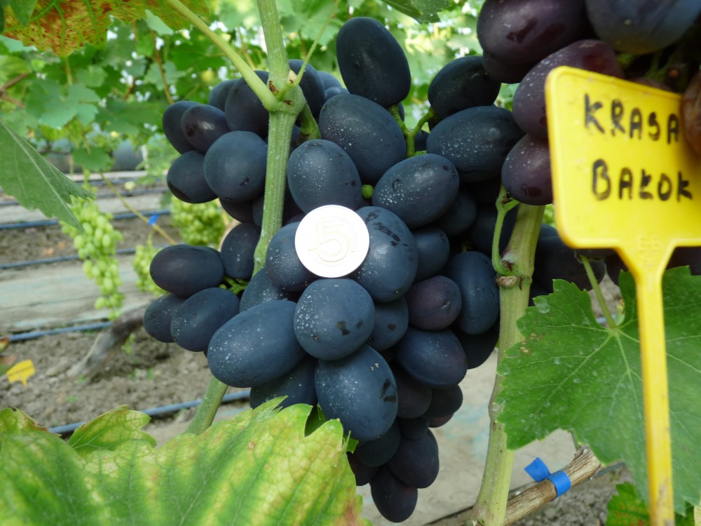 Grona luźne, stożkowe nie największej wielkości (masa w granicach 700-900g) ale skupiające bardzo duże jagody o masie dochodzącej do 30g. Jagody często są ogromne. Mają owalny kształt i kolor ciemno fioletowy wpadający w granatowy. Pokryte są bardzo atrakcyjnym woskowym nalotem. Miąższ ścisły, mięsisty i soczysty o zharmonizowanym przyjemnym smaku. Krzew rośnie średnio silnie i dobrze drewnieje.